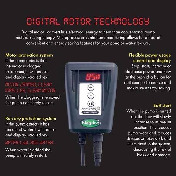 The New Blagdon Amphibious IQ Variable Flow pond pumps for filters and waterfalls, are designed to be low maintenance while giving high performance using the latest digital motor and microprocessor technology this combined gives energy savings of around 30% compared to other similar pumps. The pumps are small and have a natural looking colour that blends in with the pond easily.