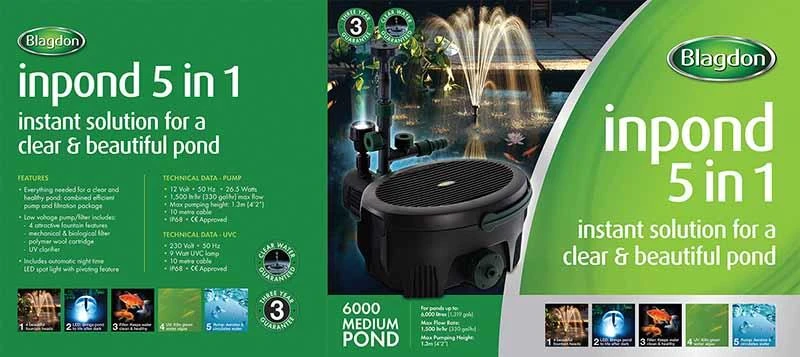 Blagdon Inpond 6000 is a complete unit for ponds up to 6000 litres – 1319 gallons, keeping your pond healthy and free from green water has never been so easy. The inpond 6000 is for ponds with no fish up to 6000L and with fish 3000 Litres. The unit also comes with an automatic LED night light and 3 fountain heads.