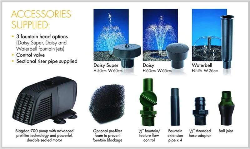 The Mini Pond 700 pump is perfectly designed for running fountains and water features in your garden. With a powerful easy to maintain motor with only one single moving part the impeller. The cage prevents to much debris from entering and clogging the impeller and preventing damage. The powerful 700 litre per hour pump can create a beautiful small waterfall, fountain or other water feature.