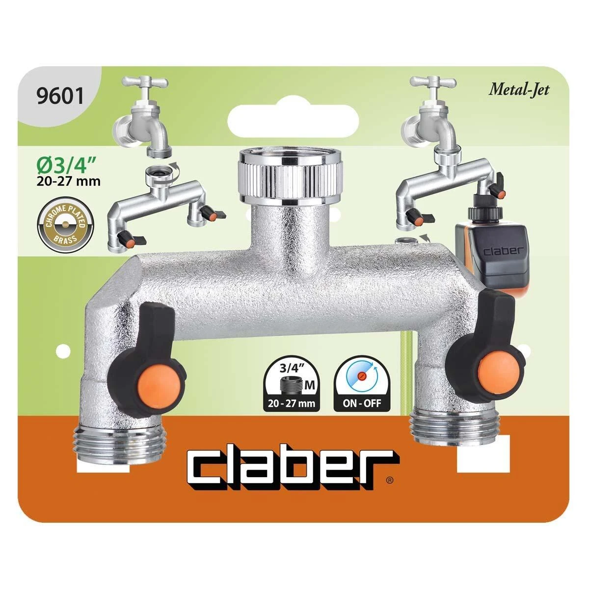Connecting this claber tap manifold directly to your outside tap gives endless options for connecting garden hoses and water timers for irrigation. Connect two water timers or one hose and a water timer on the other outlet. Each outlet also has a shut valve allowing one or both to be adjusted or isolated. Claber quality solid brass chrome plated tap manifold.